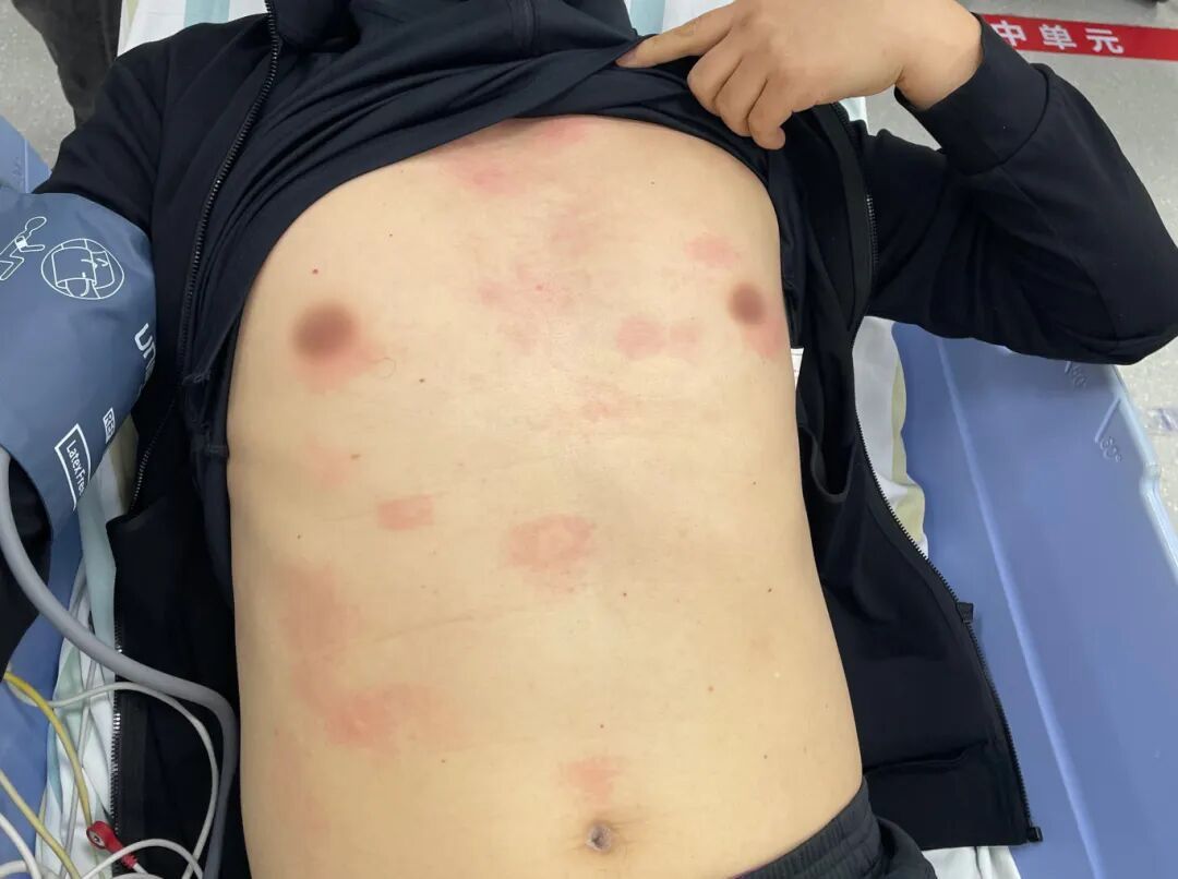 而半小时前,他正在家里美美享用网购的炸蚕蛹。胡哥提到,蚕蛹他以前也吃过没发现什么问题。这次半袋还没炫完,疹子就以肉眼可见的速度在脸和身上铺开了,还伴随着心悸的症状。