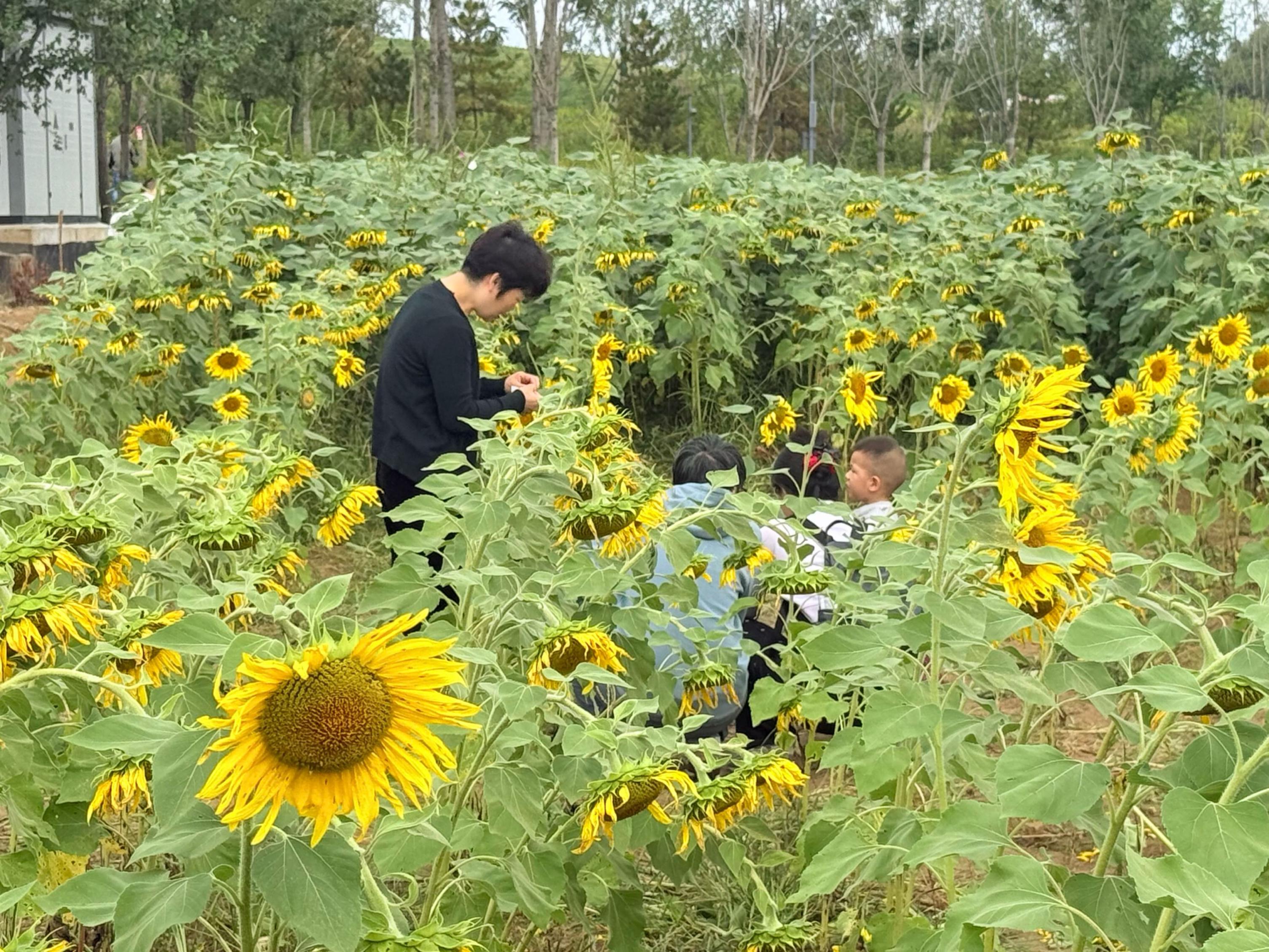 转入“田畔寻耕”区域,景象豁然开朗——木质观景台上的圆形相框前人头攒动。透过相框,金黄的向日葵与火红的高粱交织成一片秋收的海洋。高达10米的稻草人矗立其间,充满童趣。“现在在城市公园里还能看到稻草人,真难得。”家住后沙峪的孙女士带着两个孩子拍照,“孩子第一次看到真正的农作物,这片花田让人很有回到乡野的感觉。”