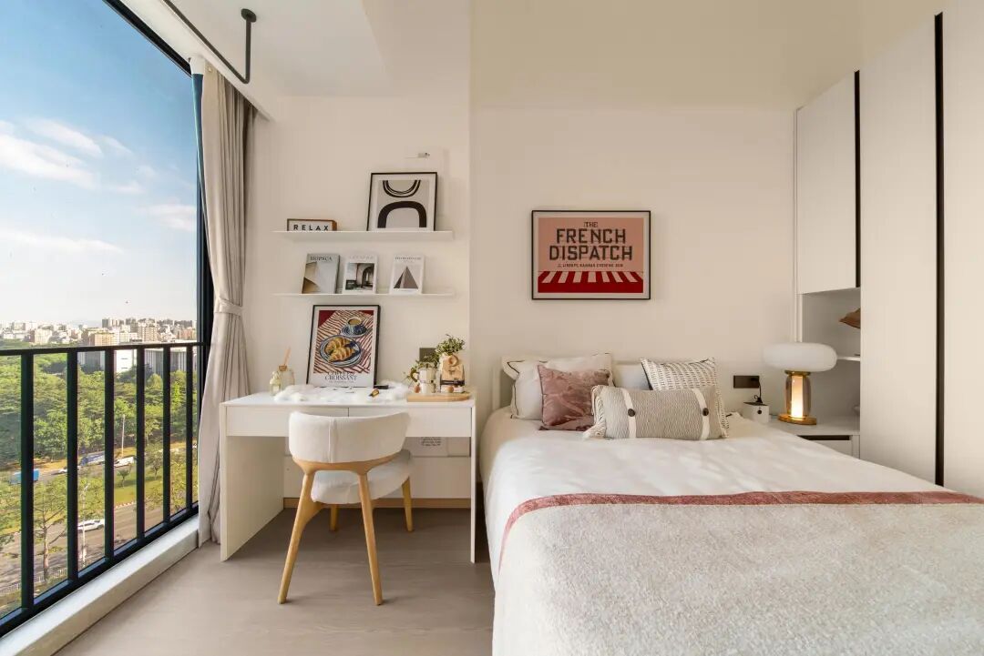 户型上,公寓主推阳光单间、两房一厅等多元产品,打造多层次产品体系。单间户型标配全景落地窗、推门见湖,遇见瞰景高层,一览奢阔城景视野。84㎡两房一厅户型更享270°环幕视野,推门见湖瞰城景,可俯瞰松山湖CBD天际线及月荷湖景观。