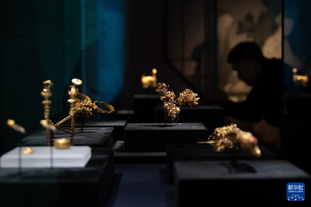 9月23日在“江流万古——长江流域古代文明瑰宝展”拍摄的展品“镶红宝石金冠”。新华社记者 杜子璇 摄
