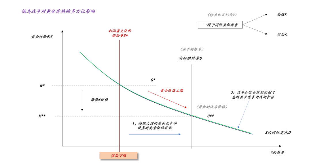 上图概括了整个过程,俄乌战争导致黄金拿到了它所能拿到的最好的组合,一方面,垄断品的供给曲线S大幅扩张;另一方面鼎茂策略,垄断品的需求曲线D保持不动,甚至出现萎缩。在这个过程中,法币贬值是一个十分自然的结果。