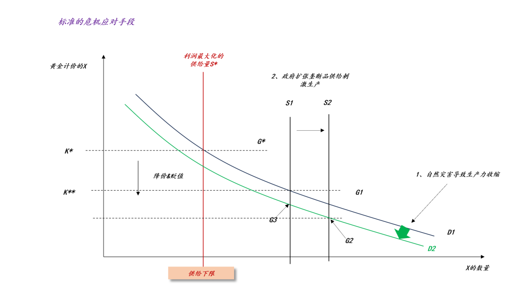 如上图所示,自然灾害(ps:模拟外部冲击)导致了全球生产力收缩,于是,垄断品的需求曲线从D1收缩至D2。如果政府保持垄断品的供给曲线在S1,那么,黄金价格会有一定幅度上涨,从G1上涨至G3。