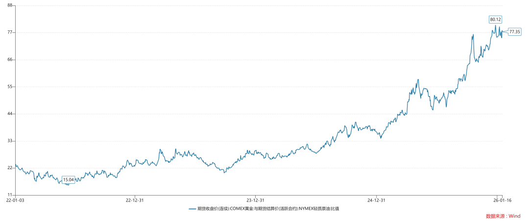 这个高维结构隐含了:当联合政府扩大垄断要素X的供给S时,黄金的价格会大幅上涨,从G*增加到G**,无论是用法币计价,还是一揽子垄断要素计价。如上图所示,目前,金油比已经来到了一个十分离谱的位置——77,这意味着,黄金计价的石油价格低到了一个十分离谱的水平。