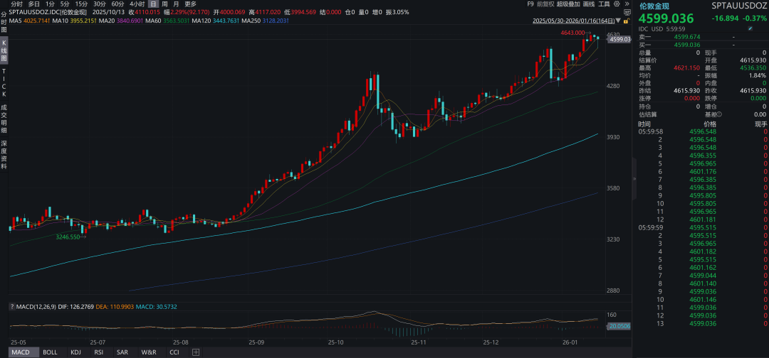 最近几年,黄金价格持续上涨,如下图所示,截至目前,一盎司黄金的价格已经来到了4600美元附近。